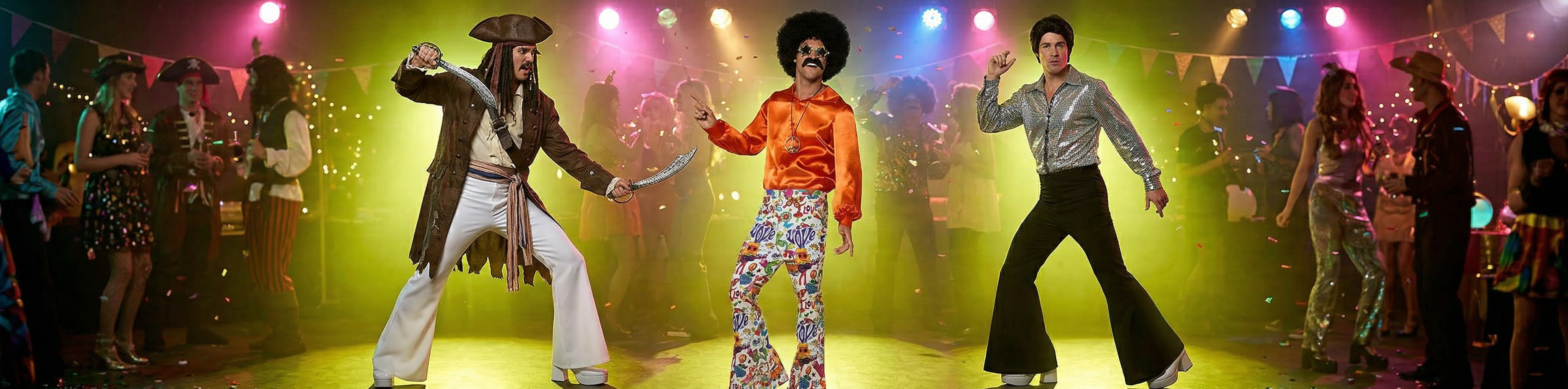 Byxor är en viktig del av din utklädnad och kan verkligen lyfta hela looken. Satsa på klassiska piratbyxor med lös passform för en äventyrlig känsla, välj cowboybyxor för en tuff westernstil eller gå all-in med disco byxor i färger, glitter eller utsvängda modeller som verkligen syns på dansgolvet 🕺